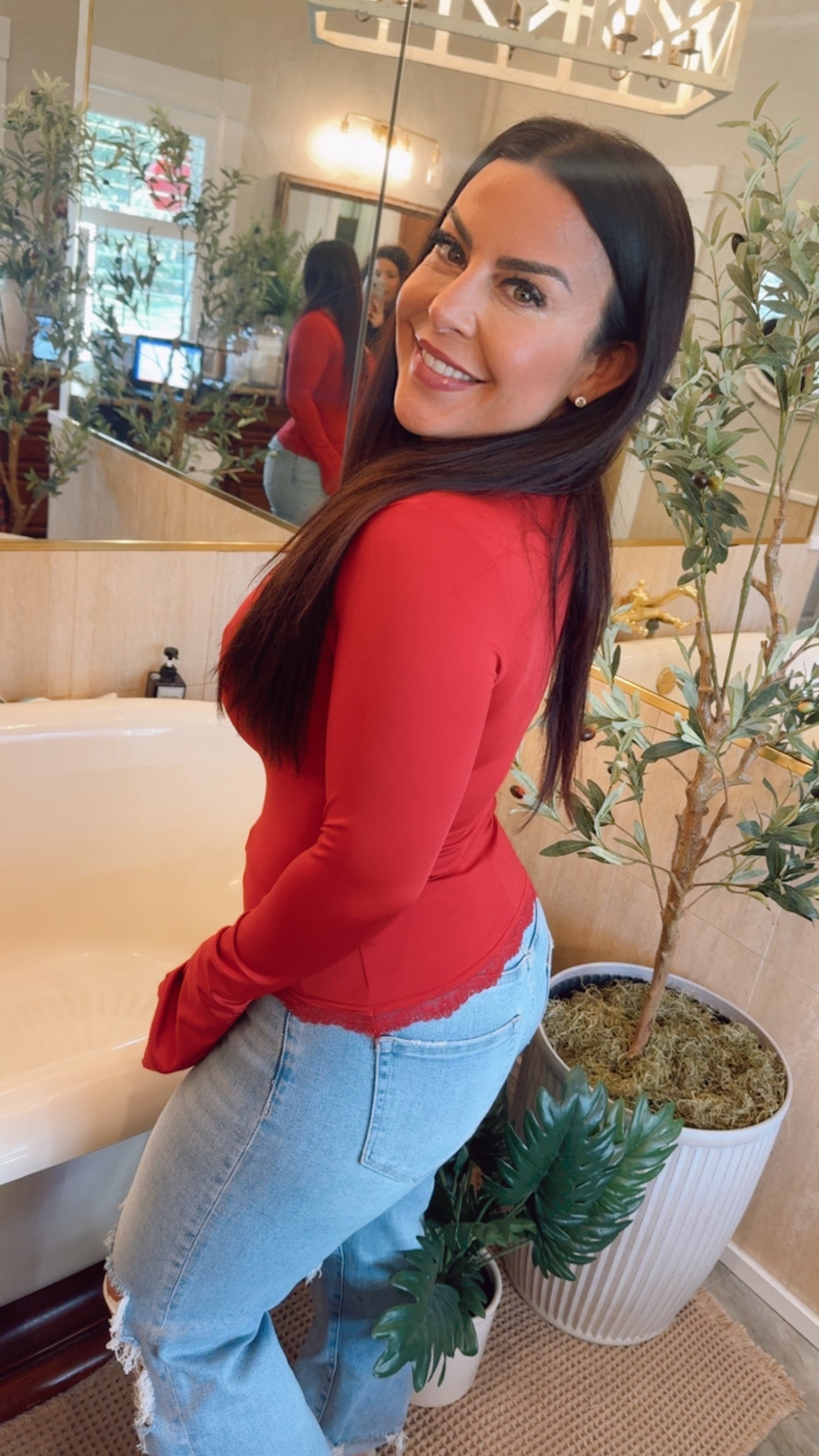 Add a touch of romance to your wardrobe with this Chic Red Lace Trim Long Sleeve Top! The vibrant red hue and delicate lace detail make it perfect for date nights, holiday parties, or just feeling festive. Soft, comfy, and figure-flattering, this top is a versatile piece you’ll want to wear again and again.