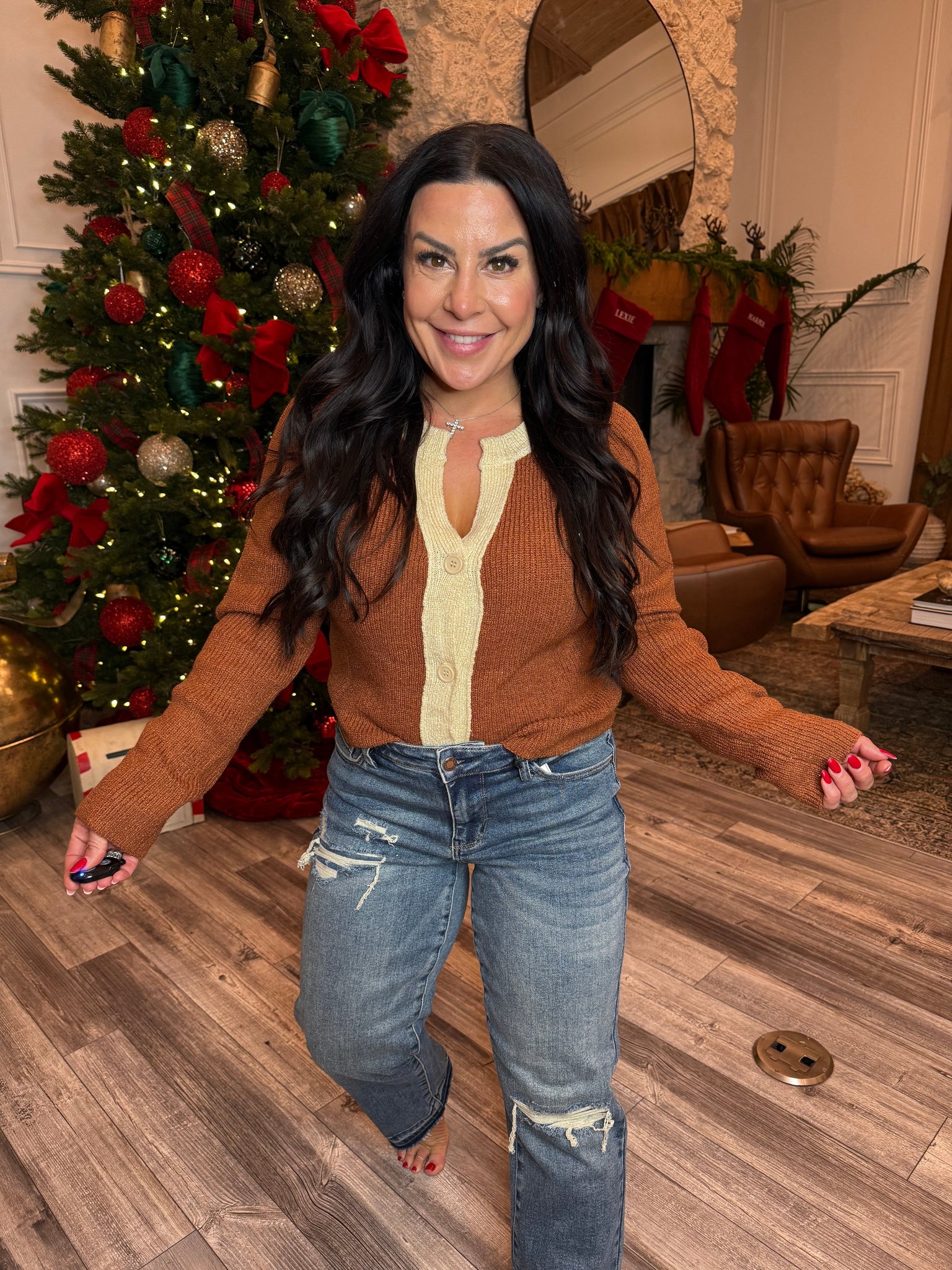 Cozy, cute, and totally fall-ready, this brown and cream button-up cardigan is your new layering BFF With soft knit fabric, a relaxed yet flattering fit, and neutral tones, it pairs perfectly with literally everything — from jeans to skirts to leggings for those chill coffee runs ☕✨