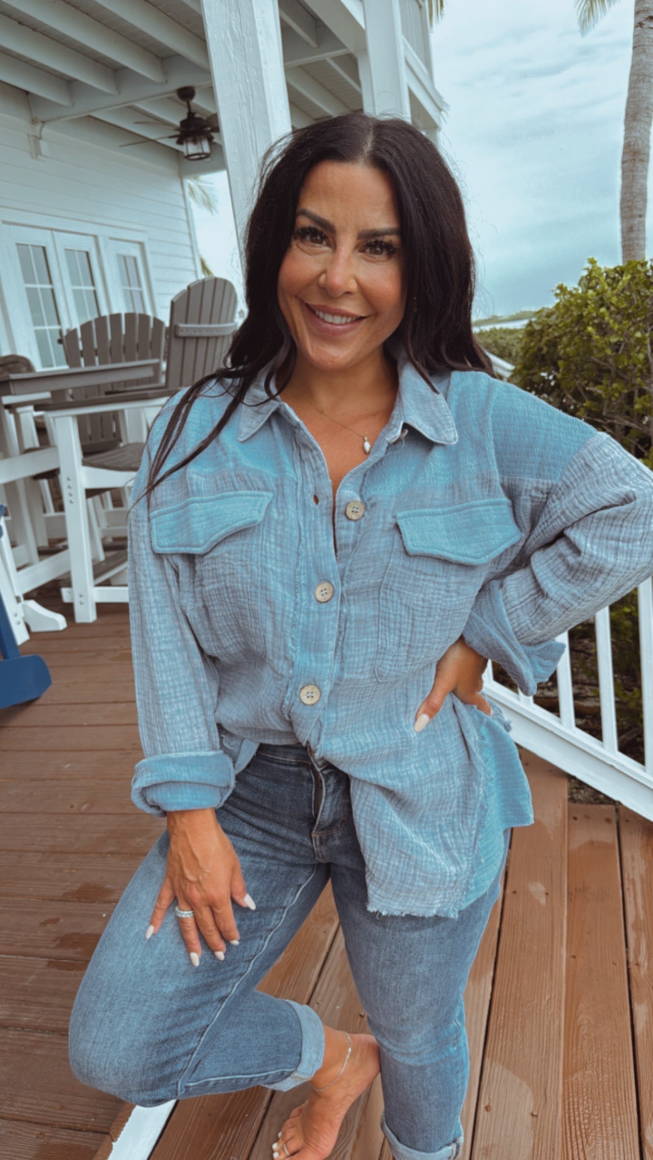 Blue Button Up Linen Long Sleeve Top