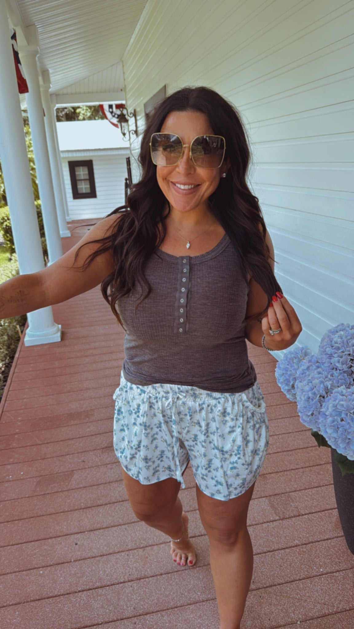 Blue and White Floral Ruffle Pocket Trim Shorts