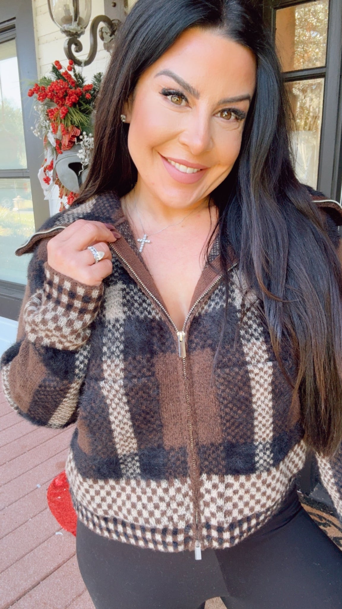 Brown and Black Plaid Knit Cozy Co Plush Jacket