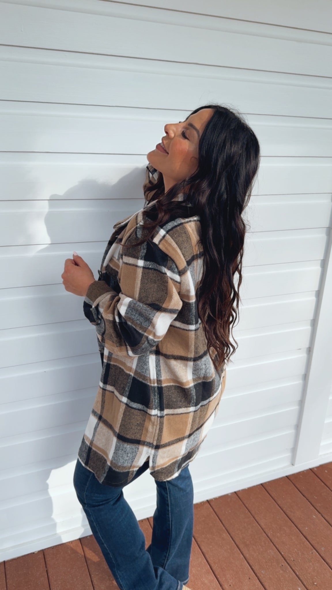 Bring cozy, on‑trend vibes to your wardrobe with the Chic Plush Brown, White & Black Plaid Shacket from Drop The Walls Boutique — the perfect layering piece that blends plush comfort with standout style. Featuring a classic brown, white, and black plaid pattern, this shacket adds fashion‑forward flair to everyday outfits while keeping you warm and comfortable through cooler days.