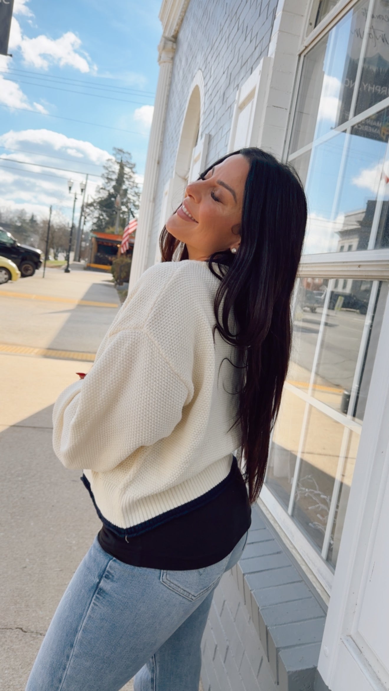 Cozy meets classic in the Ivory & Navy Cream Knit Cardigan, a chic layering piece you’ll reach for all season long. With its timeless contrast design and ultra‑soft knit fabric, this cardigan adds warmth and style to everything from casual looks to elevated cozy outfits. Whether you’re heading out for errands or layering for cooler weather, this cardigan delivers comfort and boutique style in one.